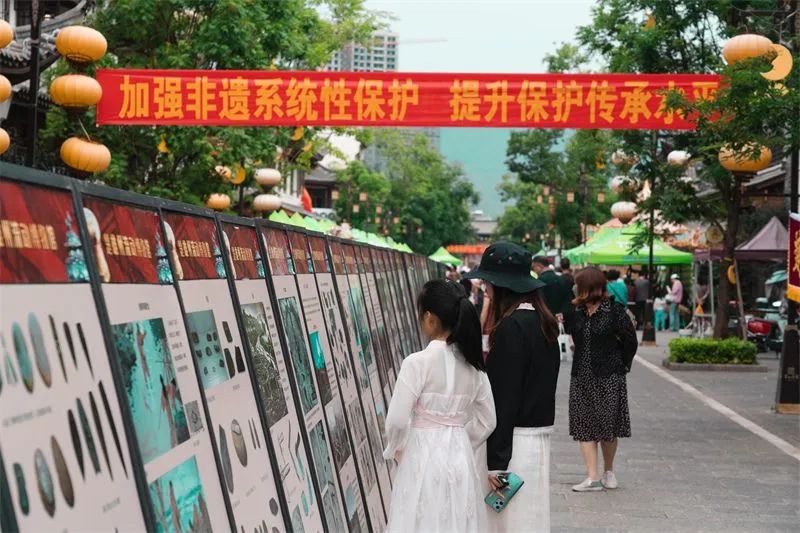 活动现场,非遗购物及商贸活动、非物质文化遗产代表性传承人现场才艺展示、楚雄州文物和古籍资料展览、非遗普法宣传等活动相继开展,琅井松毛豆腐、元谋泡果、禄丰香醋、妥甸酱油、姚安菖河蜂蜜等各种“非遗”美食好物销售十分火爆;彝族刺绣、苗族传统纺织、仁兴土陶制作等非遗项目的代表性传承人现场展示制作技艺,吸引了众多市民和游客观看;楚雄州博物馆、禄丰市博物馆把万家坝铜鼓、各种青铜器、恐龙化石等展览品带到现场,让文物“走近”群众,普及文博知识,弘扬楚雄历史文化。