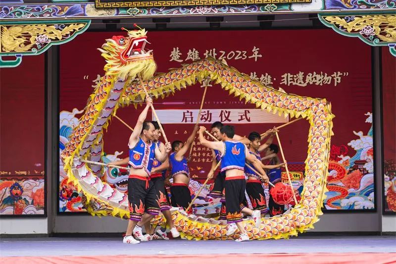 在热闹的舞龙舞狮表演《龙腾狮跃》节目中,楚雄州非物质文化遗产项目展演展示活动正式开启,广场舞《崴花灯》、梅葛演唱《过山调》、歌舞《一起来赛装》、彝剧小戏《法官老倌》等来自全州10个县(市)最具代表性和影响力的14个非遗展演节目依次登台,为现场观众献上一场非遗文化视听盛宴。展演活动还通过网络进行直播,让不能到现场的广大网友也可以感受到楚雄非遗的魅力。