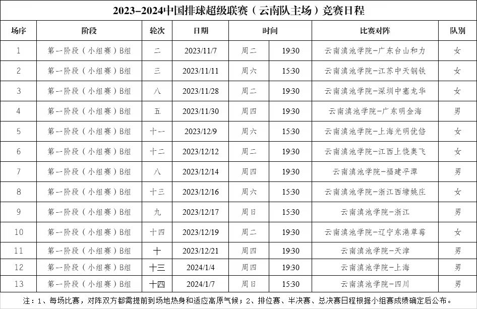 云南队第一阶段(小组赛)将于2023年11月7日至2024年1月7日在禄丰市体育馆举行,历时2个月,期间将进行13场主场比赛(其中:女队7场、男队6场)。排位赛、半决赛、总决赛日程将根据小组赛成绩另行确定。欢迎广大球迷朋友前往观赛,近距离观看全国最高水平的排球赛事,领略排球运动的超凡魅力!