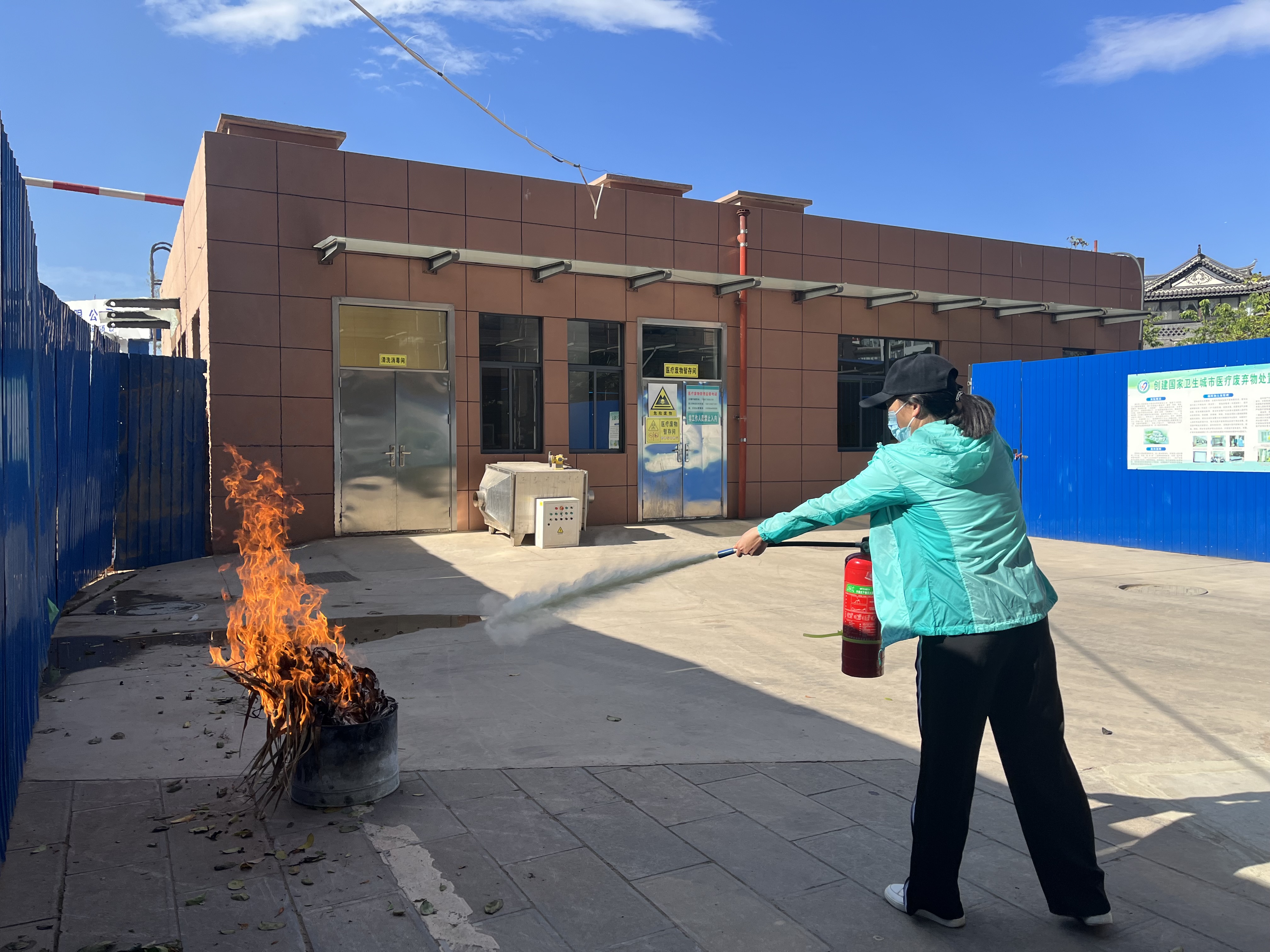 为使职工更深入的掌握灭火方法,保卫科还在室外引燃火盆,指导职工进行灭火实战操作。