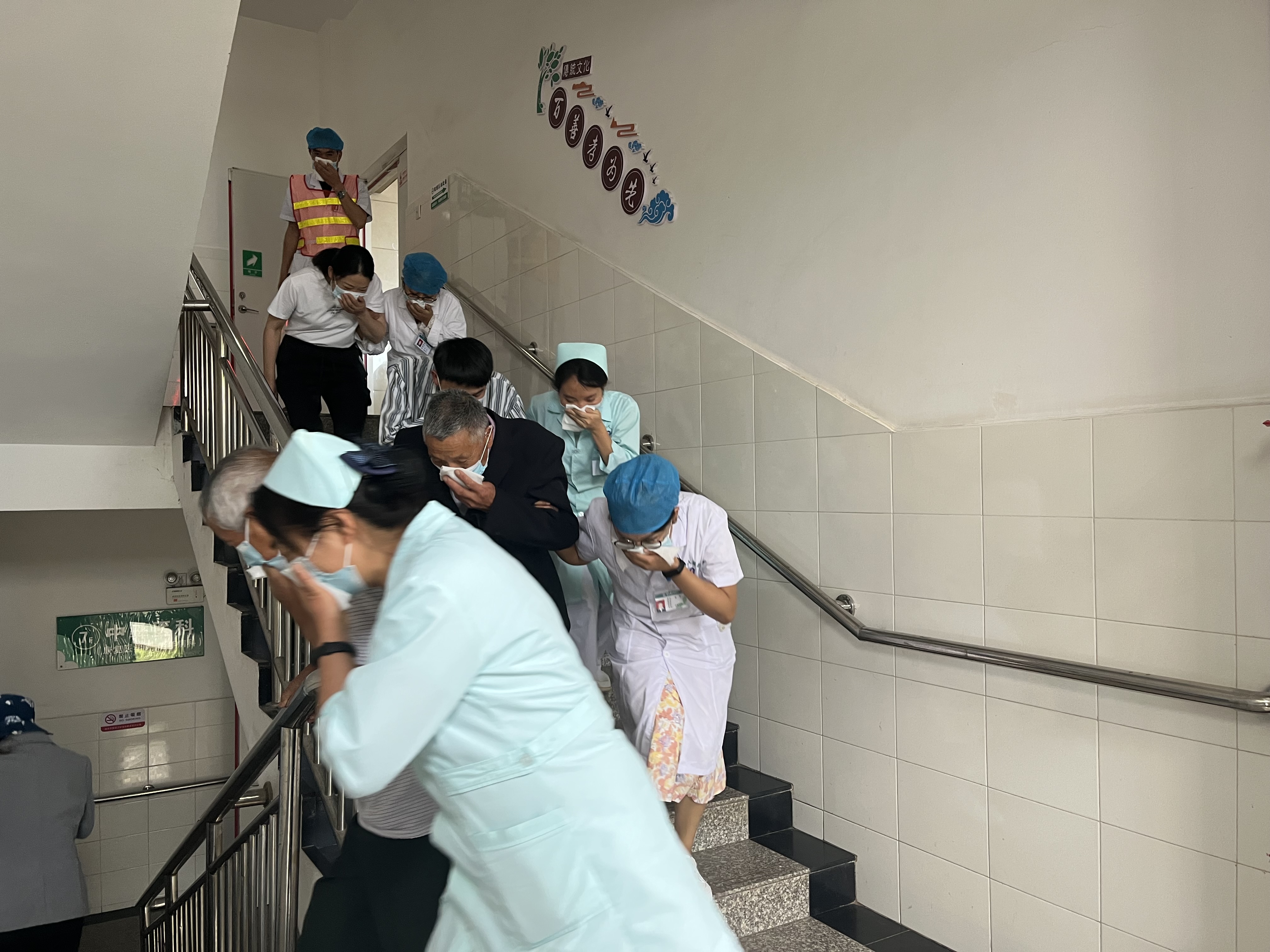 本次演练模拟医院老年病科801病房发生火灾,发现着火后,当班医务人员立刻报警并开展初期火灾的处置,及时组织疏散科室人员。另一边,消防控制中心接警后,立即通知医院微型消防站成员对火灾现场进行扑救,接着,报告院领导并立即启动应急预案,经过现场及时扑救,扑灭了初起火灾。随后,在医院总指挥的组织下,有序组织有自主行动能力的病人先行疏散,对无法行走的病人使用轮椅、推车进行疏散。最后,在确保人身安全的情况下对重要设备和物资进行疏散。