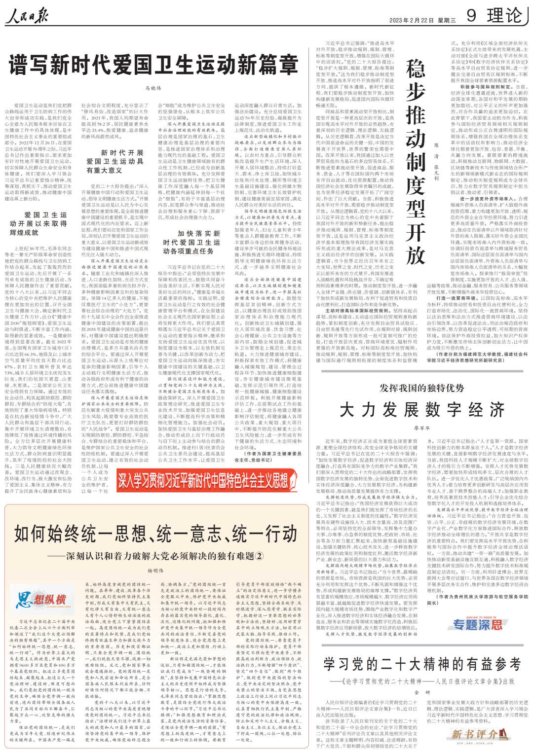 习近平总书记在党的二十大报告中指出:“必须坚持在发展中保障和改善民生,鼓励共同奋斗创造美好生活,不断实现人民对美好生活的向往。”健康是幸福生活最重要的指标。实践证明,爱国卫生运动是行之有效的社会健康管理平台和模式,在全面建设社会主义现代化国家新征程上必将发挥更大作用。我们要认真贯彻落实习近平总书记关于爱国卫生运动的重要指示精神,继承和发扬爱国卫生运动优良传统,以制度建设为根本,以长效机制完善为关键,以改革创新为动力,把爱国卫生运动向纵深推进,夯实健康中国建设的关键基础,以卫生健康现代化支撑国家现代化。