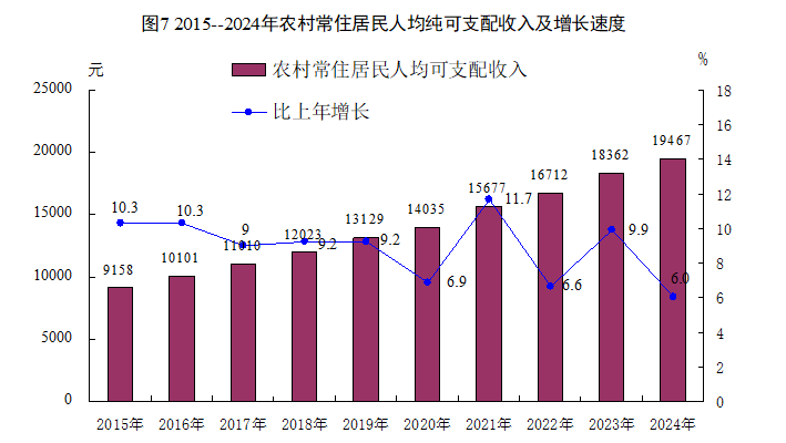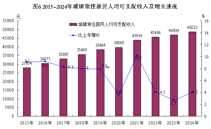 城乡常住居民人均可支配收入32516元,比上年增长4.7%,其中:农村常住居民人均可支配收入19467元,比上年增加1105元,增长6.0%;城镇常住居民人均可支配收入48823元,比上年增加1899元,增长4.0%。