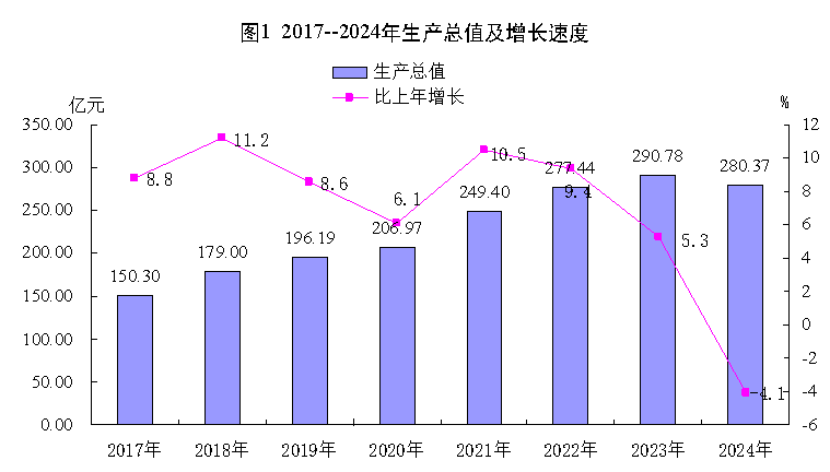 初步核算,全年实现地区生产总值(GDP)2803705万元,按可比价格计算,比上年下降4.1%。其中:第一产业增加值583217万元,比上年增长2.4%,拉动经济增长0.47个百分点;第二产业增加值1079119万元,比上年下降16.6%,下拉经济增长6.96个百分点;第三产业增加值1141369万元,比上年增长6.2%,拉动经济增长2.39个百分点。三次产业对地区生产总值增长的贡献率分别为11.5%、-169.7%和58.2%。