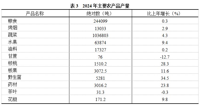 全年实现农林牧渔业总产值943560万元,按可比价格计算,比上年增长2.5%。全年粮食种植面积646657亩,比上年增加1527亩,增长0.2%;经济作物种植面积735196亩,比上年增加16171亩,增长2.2%。全年粮食产量244099吨,比上年增加802吨,增长0.3%。其中:秋粮192637吨,比上年增长0.2%;夏粮51462吨,比上年下降0.9%。粮食作物与经济作物种植比为47:53,粮食作物种植比与上年持平。全年完成造林面积0.215万亩,全市森林综合覆盖率64.6%。