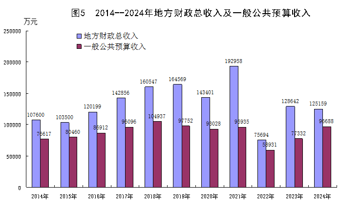 全年完成地方财政总收入(一般公共预算收入+上划收入)125159万元,比上年减收3483万元,下降2.7%。其中:上划中央收入21279万元,比上年下降45.4%;上划省级收入7192万元,比上年下降41.7%;一般公共预算收入96688万元,比上年增长25.0%。完成政府性基金预算收入50326万元,比上年增收15129万元,增长43.0%。一般公共预算支出311620万元,比上年增支28100万元,增长9.9%;完成政府性基金预算支出141283万元,比上年减支948万元,下降0.7%。