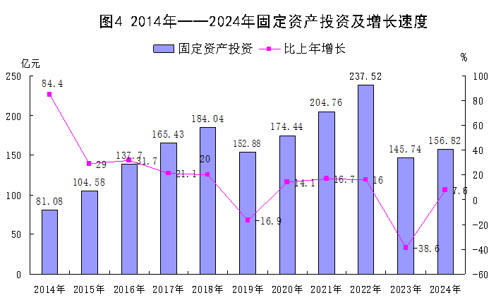 全年完成规模以上固定资产投资1568162万元,比上年增长7.6%。其中:5000万元以上非房地产项目投资完成844653万元,比上年增长4.7%;5000万元以下非房地产项目投资完成384113万元,比上年增长171.4%;房地产项目投资完成35156万元,比上年下降66.2%;跨境项目投资完成304240万元,比上年下降24.8%。