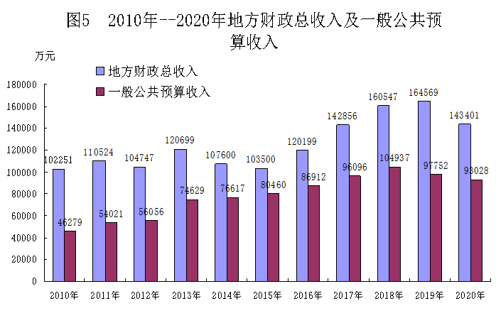全年完成地方财政总收入(一般公共预算收入+上划收入)143401万元,比上年减收21168万元,下降12.9%。其中:上划中央收入43320万元,下降14.4%;上划省级收入7053万元,下降56.4%;一般公共预算收入93028万元,下降4.8%。完成政府性基金预算收入35623万元,比上年增收211万元,增长0.6%。完成一般公共预算支出321289万元,比上年增支25277万元,增长8.5%;完成政府性基金预算支出144646万元,比上年增支85714万元,增长145.4%。