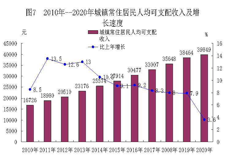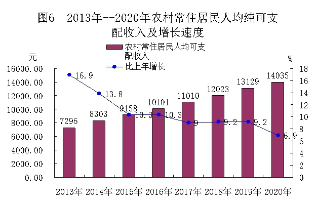 农村常住居民人均可支配收入14035元,比上年增加906元,增长6.9%;城镇常住居民人均可支配收入39849元,比上年增加1385元,增长3.6%。