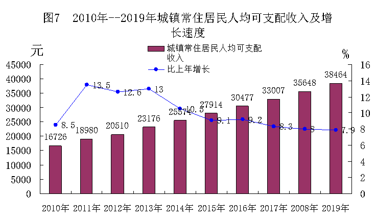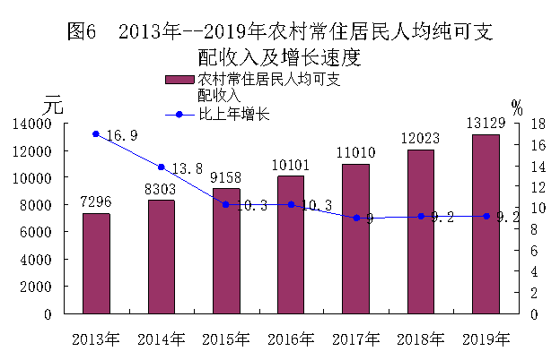 农村常住居民人均可支配收入13129元,比上年增加1106元,增长9.2%;城镇常住居民人均可支配收入38464元,比上年增加2816元,增长7.9%。