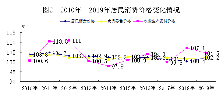 全县居民消费价格总水平比上年上涨2.2%。居民消费价格中,食品烟酒价格上涨5.8%(其中粮食价格下降0.9%);衣着价格下降0.8%;居住价格下降4.1%;生活用品及服务价格上涨1.4%;交通通信价格下降2.2%;教育文化和娱乐价格上涨5.8%;医疗保健价格上涨9.9%;其他用品和服务价格下降3.2%。商品零售价格总水平上涨2.4%。农业生产资料价格总水平上涨4.5%。