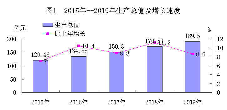 初步核算,全年实现地区生产总值(GDP)1895017万元,按可比价格计算,比上年增长8.6%。其中:第一产业增加值383898万元,增长5.7%,拉动经济增长1.1个百分点;第二产业增加值666496万元,增长13.1%,拉动经济增长4.9个百分点;第三产业增加值844623万元,增长5.9%,拉动经济增长2.6个百分点。第一、二、三产业对生产总值增长的贡献率分别为13.3%、56.9%和29.8%。