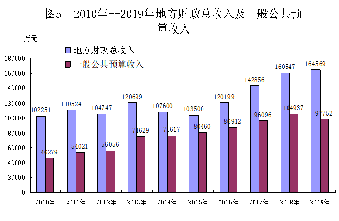 全年完成地方财政总收入(一般公共预算收入+上划收入)164569万元,比上年增收4022万元,增长2.5%。其中:上划中央收入50628万元,增长7%;上划省级收入16189万元,增长95.7%;一般公共预算收入97752万元,下降6.8%。完成政府性基金预算收入35412万元,比上年增收2056万元,增长6.2%。完成一般公共预算支出296012万元,比上年减支30048万元,下降9.2%;完成政府性基金预算支出58932万元,比上年增支30049万元,增长104%。