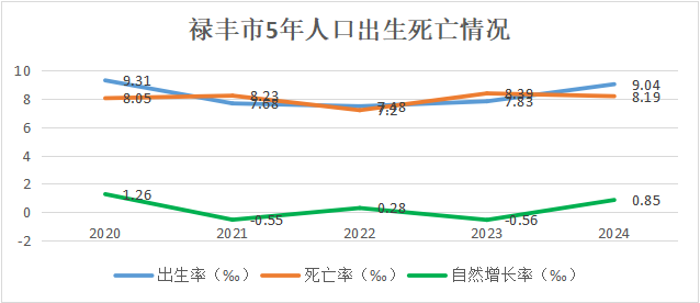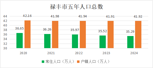 第七次全国人口普查(2020年)以来,禄丰市常住人口呈现持续下降趋势,5年共减少1.36万人,平均每年减少2720人,户籍人口总体呈下降趋势,5年间共减少0.24万人。这一现象与全国多地情况相似,人口总量减少主要受自然增长率下滑和机械负增长(即户籍迁出人口长期高于迁入人口)的双重影响。禄丰市作为传统人口流出地区,青壮年劳动力外流比例持续扩大,导致常住人口规模逐步萎缩。