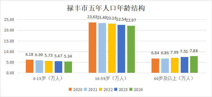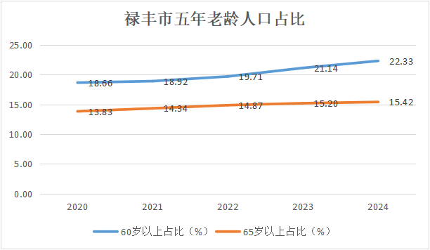 5年来,60岁及以上人口占总人口比重从2020年的18.66%上升到2024年的22.33%(超全国0.33个百分点,超全省4.41个百分点,超全州1.02个百分点),以年均0.73个百分点的速度递增。其中65岁以上人口占总人口比重从2020年的13.83%上升到2024年的15.42%(低于全国0.18个百分点,超全省3.35个百分点,超全州0.68个百分点),以年均0.32个百分点的速度递增。禄丰已进入中度老龄化阶段,老年人口绝对数量持续增加,叠加人均预期寿命延长,使养老保障压力显著增大。