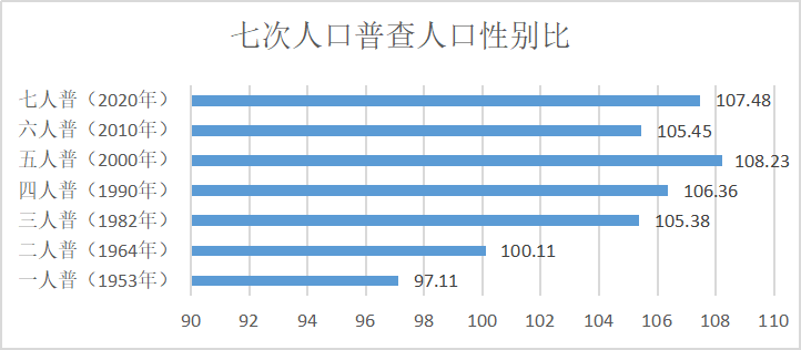 人口性别比是一个重要的衡量男女两性人口是否均衡的标志,一般以100个女性人口相对应男性人口的数值来表示。禄丰市从一人普到七人普的67年间,除了1953年一人普时由于战争遗留的历史问题导致女性人口多于男性人口外,其余普查年度男性人口均高于女性人口。女性人口的平均预期寿命长于男性人口和男性人口数量多于女性人口是导致适龄婚育人口男多女少的主要原因。