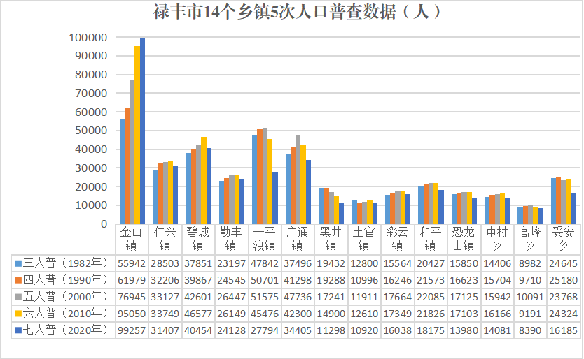 从14个乡镇的人口发展情况看,5次普查除金山镇人口一路上涨和黑井镇人口一路下跌外,其余12个乡镇均是从涨到跌,其中一平浪镇2010年到2020年间人口断崖式下降。从三人普到七人普,全市各乡镇人口趋势走向与当地经济发展水平达到了高度一致。