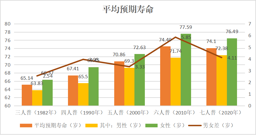 随着人民生活水平和医疗水平的不断提高,从5次人口普查测算的0岁人口平均预期寿命看,1982年到2020年38年间平均预期寿命从65.14岁到74.1岁,增加了8.96岁,其中男性人口平均预期寿命增加了8.55岁,女性人口平均预期寿命增加了10.12岁。38年间女性人口平均预期寿命始终高于男性人口平均预期寿命,其中2010年两性人口相差达5.85岁。