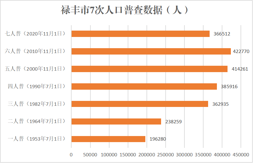 1953年7月1日开展的第一次全国人口普查数据显示,禄丰市总人口为196280人,67年间人口增长到366512人,增长了86.7%。从历次普查数据看,1953年到1982年是人口高速发展时期,1978年计划生育正式写入宪法,由于人口基数大和人口发展的延迟效应,1982年到2010年人口数据依然缓慢上升,2010年到2020年10年间出生率和机械增长率过低直接导致人口快速下降。其中1982年和2020年人口数据较接近,但人口的发展方向却截然相反。