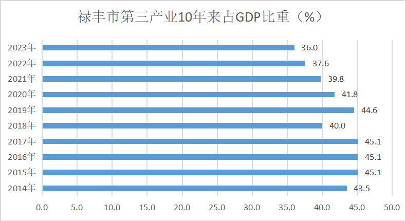 从占比看,随着禄丰市第二产业的快速发展,禄丰市第三产业增加值占地区生产总值的比重总体呈下降趋势,从2014年的43.5%下降到2023年的36.0%。