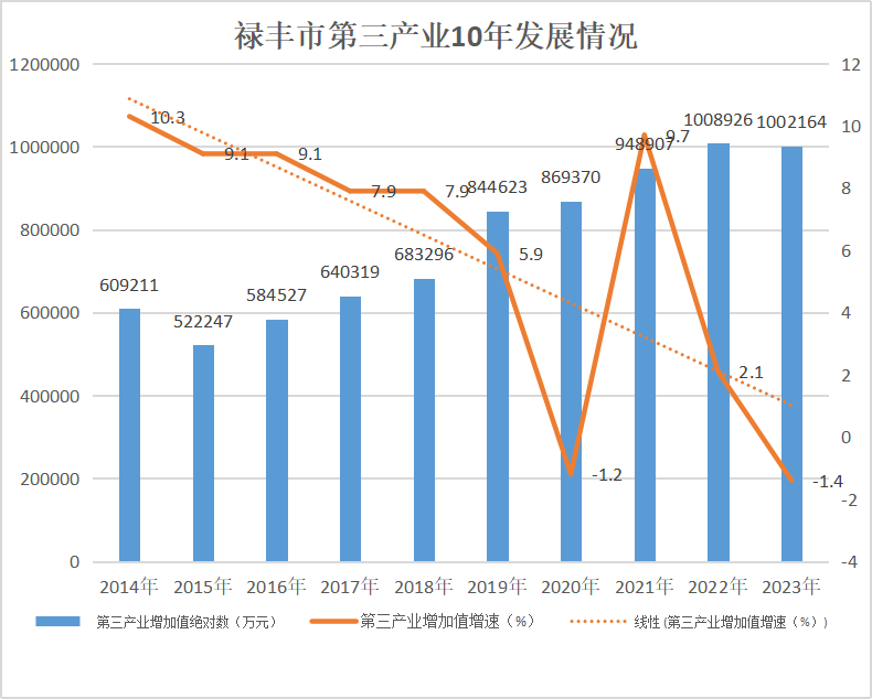 10年来,禄丰市第三产业发展迅速,已成为推动地方经济增长的重要力量。第三产业增加值从2014年的609211万元到2023年的1002164万元,增加了392953万元,增长了1.65倍。10年平均增速为5.9%,从趋势线看,增速陡峭下降,增速最高为2014年的10.3%,最低为2023年-1.4%。