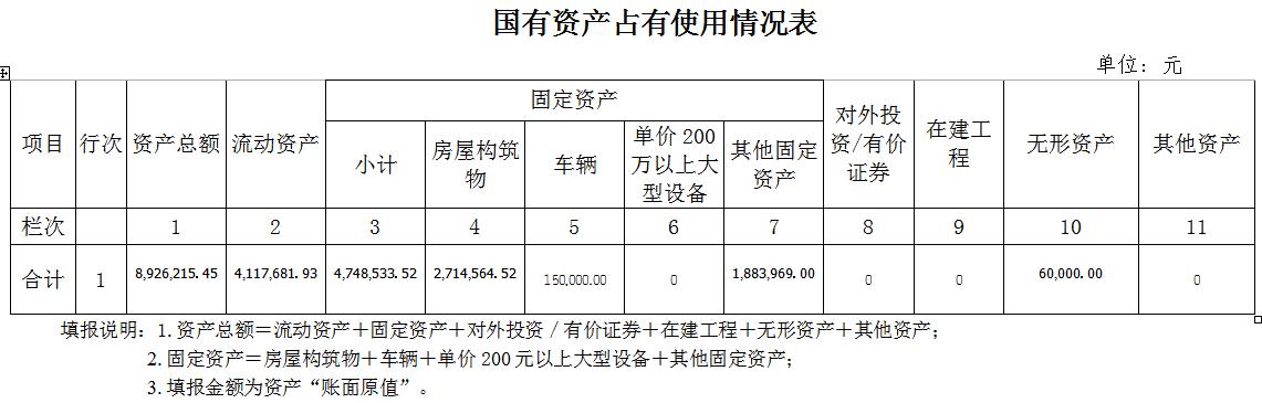 截至2021年12月31日,禄丰市仁兴镇卫生院资产总额8,926,215.45元,其中,流动资产4,117,681.93元,固定资产4,748,533.52元,对外投资及有价证券0元,在建工程0元,无形资产60,000.00元,其他资产0元(具体内容详见附表)。与上年相比,本年资产总额增加2,028,763.09元,其中固定资产增加1,001,350.00元。处置房屋建筑物0平方米,账面原值0元;处置车辆0辆,账面原值0元;报废报损资产0项,账面原值0元,实现资产处置收入0元;出租房屋0平方米,账面原值0元,实现资产使用收入0元。