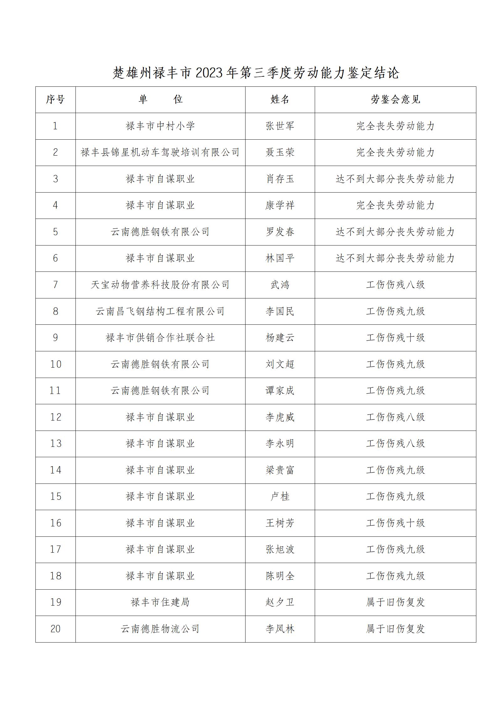 楚雄州禄丰市2023年3季度劳动能力鉴定工作已于9月14日结束,为接受社会监督,现将张世军等20人鉴定结论在我市进行公示(名单附后),公示时间为2023年9月18日至2023年9月24日。如发现相关单位及人员在劳动能力鉴定过程中存在弄虚作假和徇私舞弊等行为的,可在公示期内向禄丰市人力资源和社会保障局社会保险股反映。