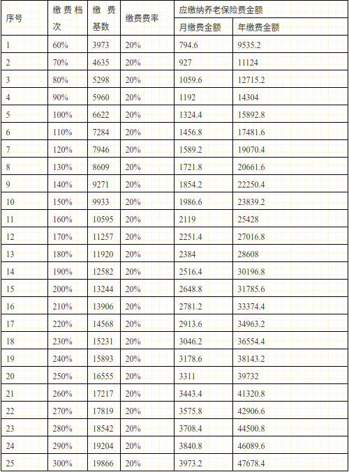2022年,个体灵活就业人员共有25个缴费档次供参保人自主选择。缴费基数一经缴费人确定,本年度不得变更。各个缴费档次见下表: