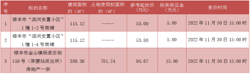 受禄丰市财政局委托,云南金槌拍卖有限公司将于2022年11月30日15:00时在云南省公共资源交易信息网对位于禄丰市“滨河安置小区”商铺2间、金山镇杨家庄街159号(原腰站派出所)房地产一宗进行公开拍卖,现将有关事项公告如下: