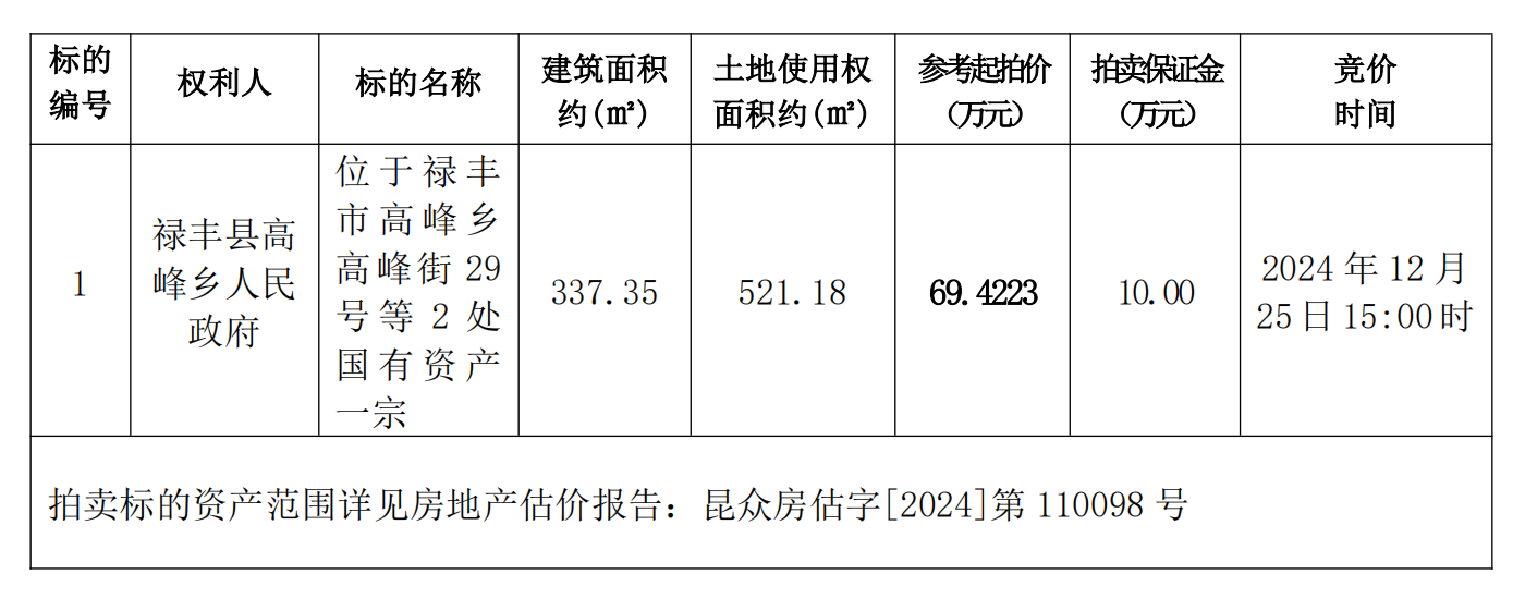 受禄丰市高峰乡人民政府委托,云南金槌拍卖有限公司将于2024年12月25日15:00时开始在云南省公共资源交易信息网对位于禄丰市高峰乡高峰街29号等2处一宗国有资产进行公开拍卖,现将有关事项公告如下: