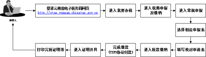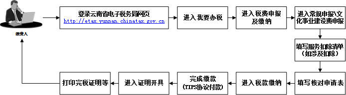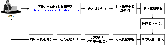 网络申报。缴费人登录国家税务总局云南省税务局官网(网址:http://etax.yunnan.chinatax.gov.cn) 进入云南省电子税务局;点击“我要办税”,进入“税费申报及缴纳”菜单,在“常规申报”子菜单选择“非税收入通用申报”,在“非税收入通用申报表”中填入相关数据→点击“提交”,提交成功后点击“全申报”,待系统提示全申报已成功后进入“税款缴纳”子菜单,系统提示数据已导入,点击“TIPS协议付款”完成基金缴纳。需要打印完税证明等税收完税凭证的,缴费人可进入“我要办税”选择“证明开具”菜单,点击相应项自行打印完税证明等。(如因系统功能升级和页面变更,上述相关功能模块位置发生变化,按系统提示进行相应操作。)