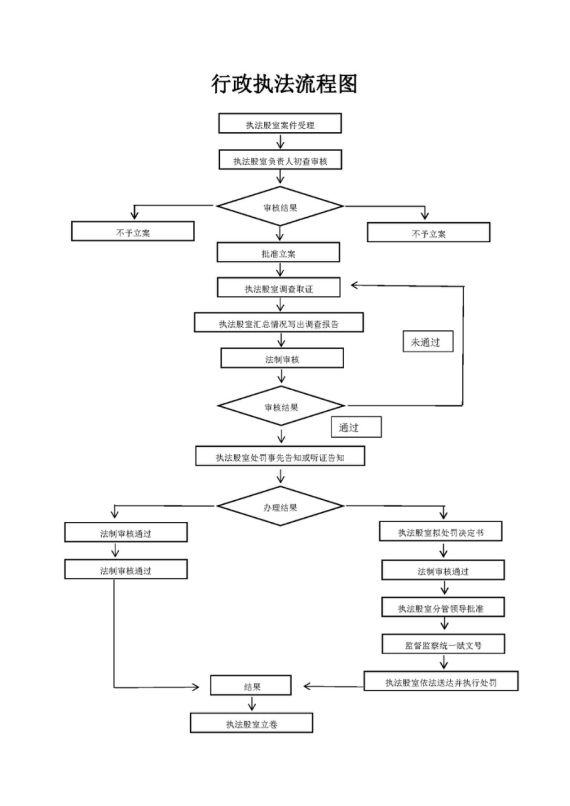 发现违法事实→立案→调查取证→提出行政处罚意见→法制机构审核 →(重大复杂的,由局负责人集体讨论决定)→ 行政处罚事前告知→作出行政处罚决定→送达 →执行→结案→归档。