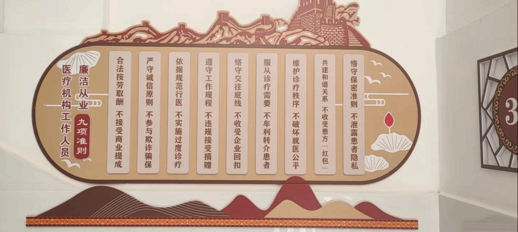 三、定期或不定期组织全院职工学习《医疗机构工作人员廉洁从业九项准则》等廉政建设相关政策、法规、制度,并第七进行考评公示。在“清廉医院”创建过程中,把《医疗机构工作人员廉洁从业九项准则》作为上墙制度之一,医院全体职工均签订了“廉洁从医承诺书”,包括但不限于卫生专业技术人员、管理人员、后勤人员以及在医疗机构内提供服务、接受医疗机构管理的其他社会从业人员,依据《医疗机构工作人员廉洁从业九项准则》有关要求,服从管理、严格要求。