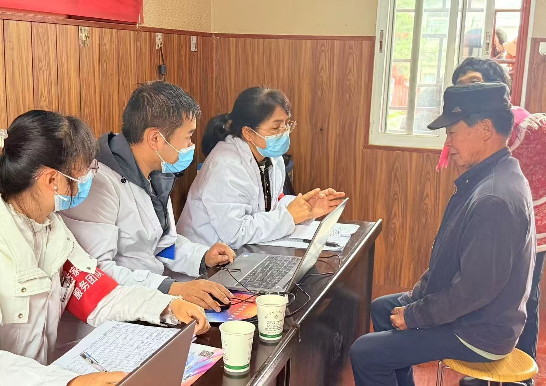在乡村诊疗活动现场,虽然阴雨绵绵,但前来问诊的乡亲们仍络绎不绝。中村卫生院家签团队和村医以村委会为单位,为前来看诊的老乡登记信息,量血压、测血糖等检测。专家们耐心细致地为每一位村民检查身体、询问病情,针对不同病症和个体差异给出个性化的治疗方案与健康指导,对于有慢性病且用药不合理的患者,专家们及时为患者调整用药方案并普及日常健康管理知识。