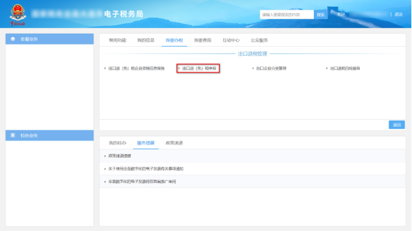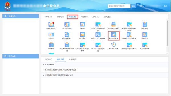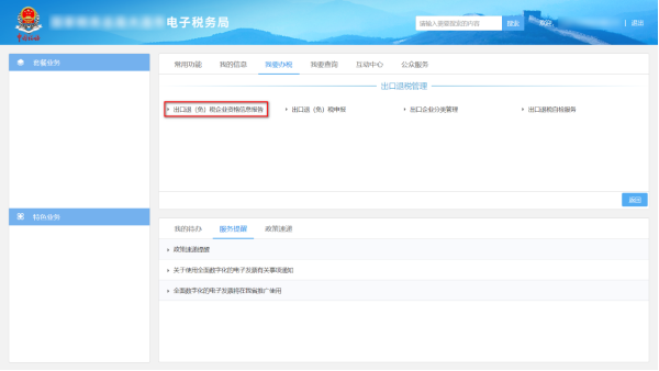 登录电子税务局后,通过“我要办税”->“出口退税管理” ->“出口退(免)税企业资格信息报告” ->“出口退(免)税备案”,选择“在线申报”进入出口退(免)税备案模块。如图: