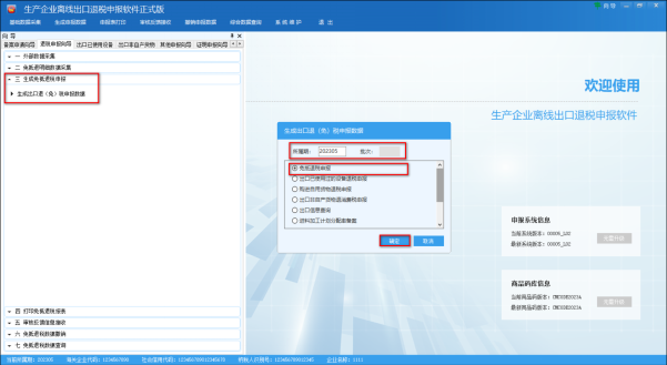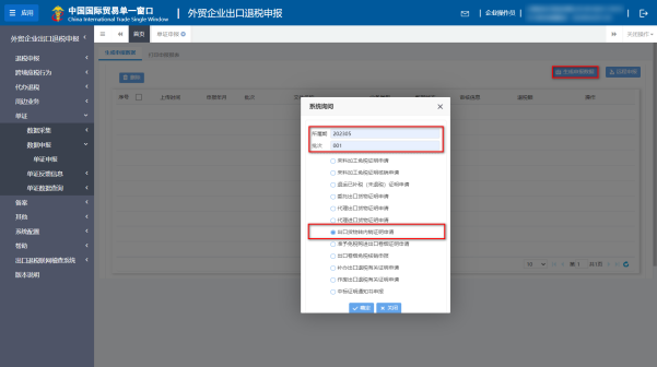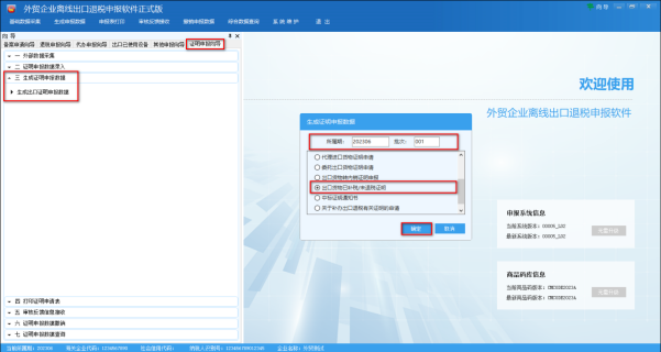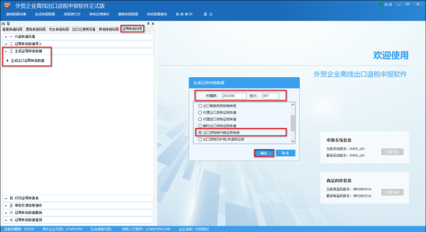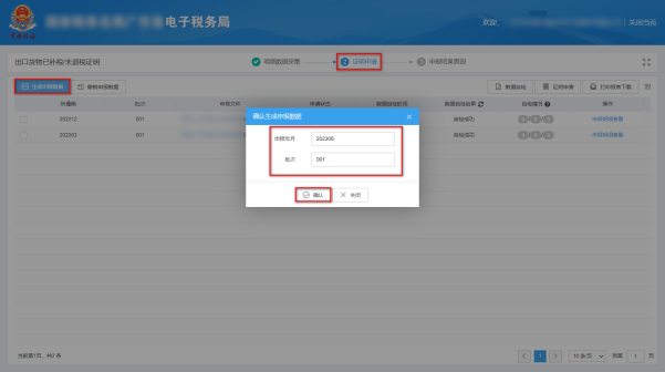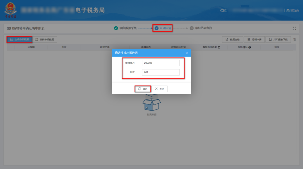 选择申报系统“证明申报向导”第三步“生成证明申报数据”,选择“出口货物已补税/未退税证明”,输入“所属期”及“批次”,再点击【确定】按钮,生成申报数据保存至本地电脑。如图: