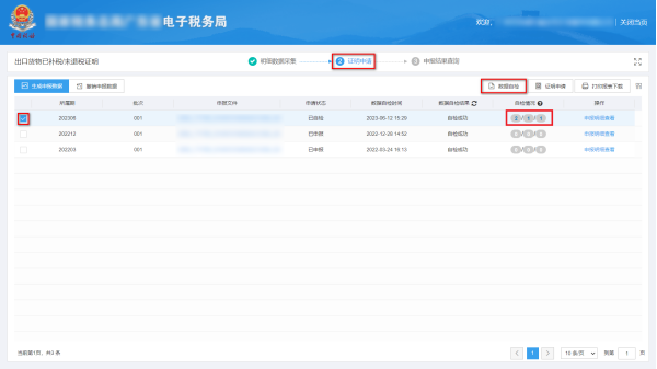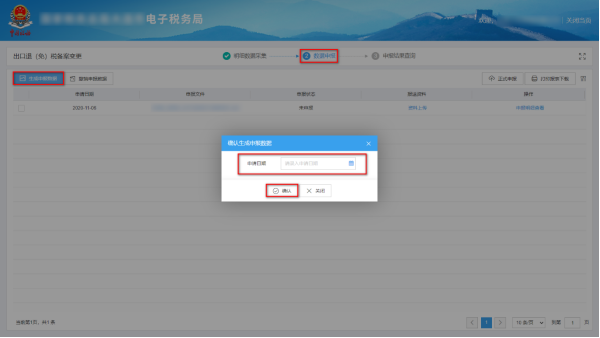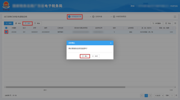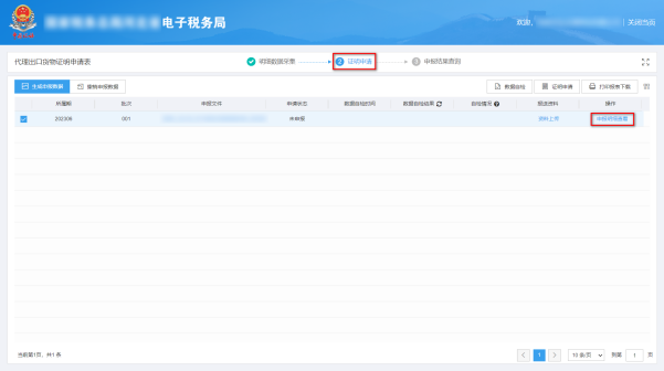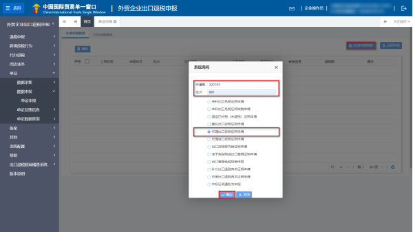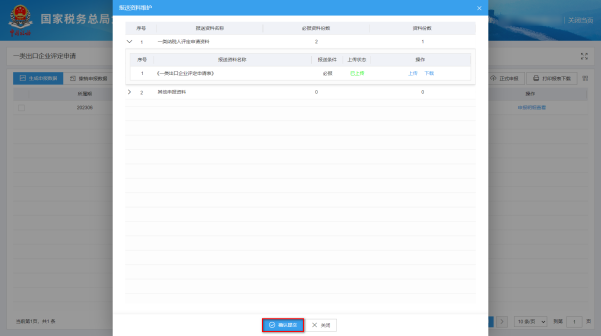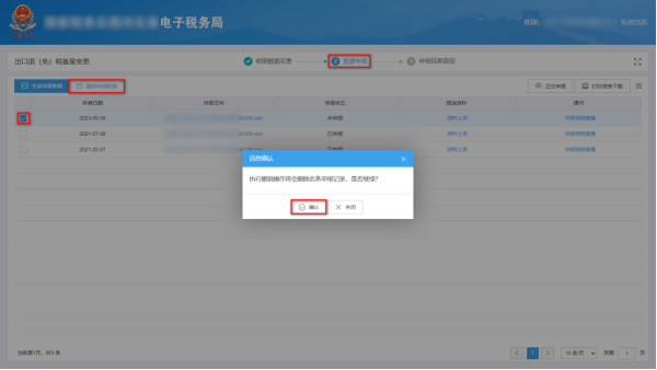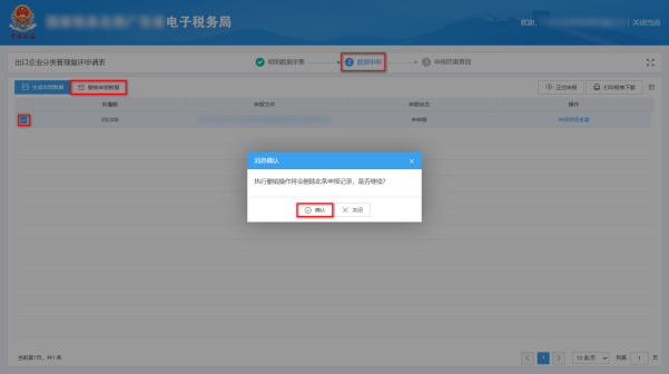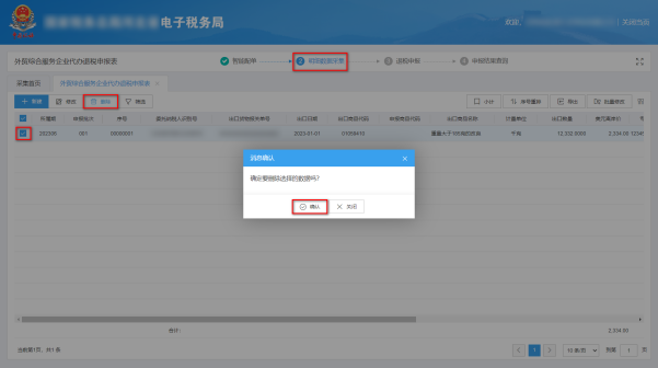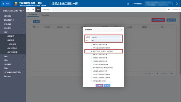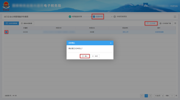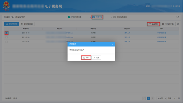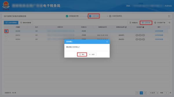 勾选需要正式申报的数据,点击【证明申请】按钮,再点击【确认】按钮,将申报数据正式申报。如图: