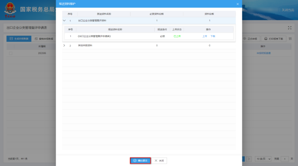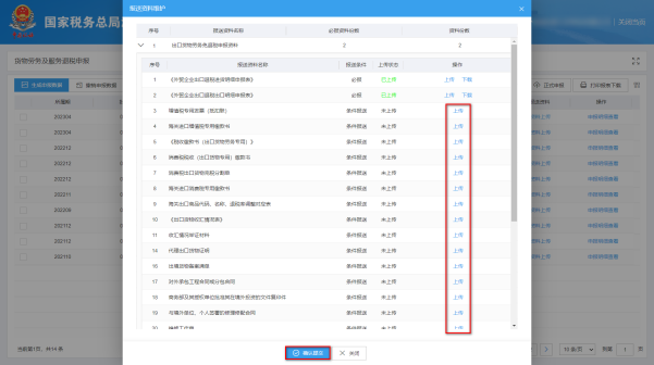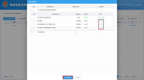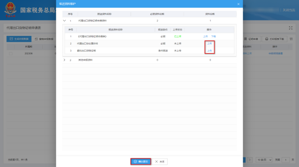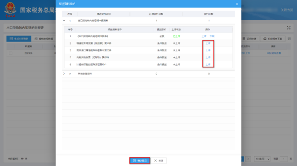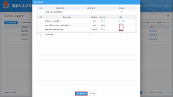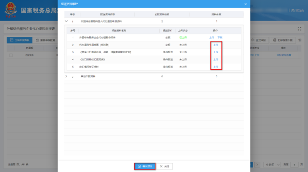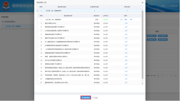 点击【资料上传】按钮,按需要上传相关附列资料,再点击【确认提交】按钮,提交上传的附列资料。如图: