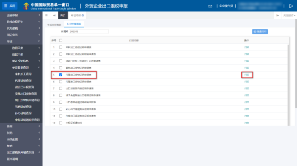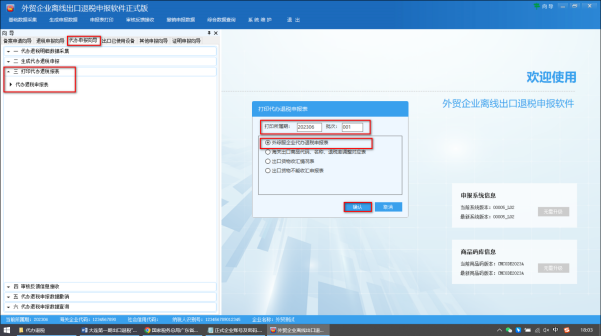 选择申报系统“证明申报向导”第四步“打印证明申请表”,选择“代理出口货物证明申请表”,录入“打印所属期”及“批次”,点击【确定】按钮。如图:
