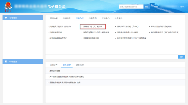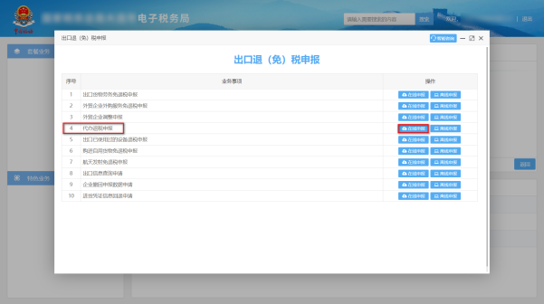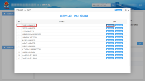 登录电子税务局后,通过“我要办税”->“证明开具”->“开具出口退(免)税证明”->“代理出口货物证明开具”,选择“在线申报”进入申报模块。如图: