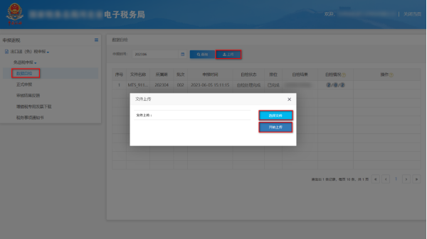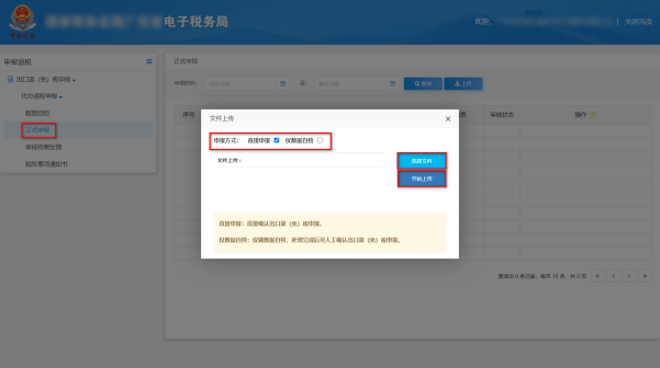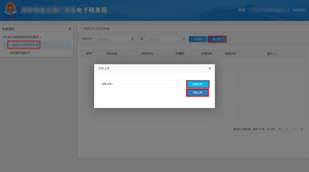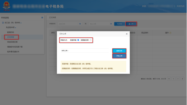 选择“一类出口企业评定申请”进入“正式申报”界面,点击【上传】按钮,再点击【选择文件】按钮,选择生成的申报数据文件,最后再点击【开始上传】按钮,完成正式申报操作。