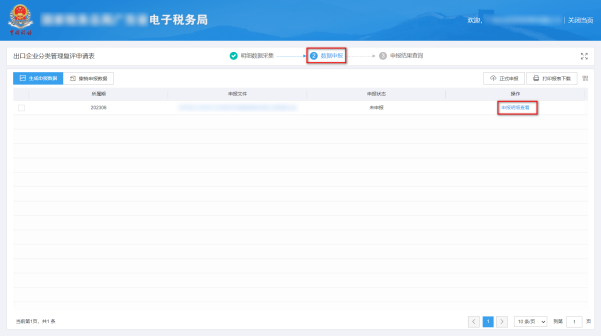 生成申报数据后,可在其他申报数据查询中查看。选择申报系统“证明申报向导”第六步“其他申报数据查询”,再选择“出口企业分类管理复评申请”。如图: