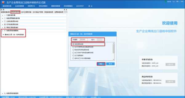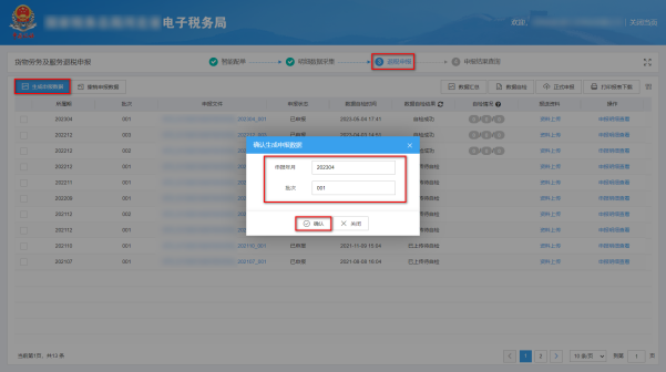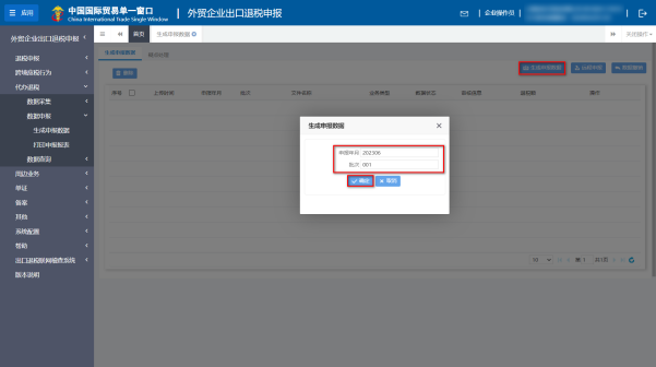 点击【生成申报数据】按钮,选择“出口货物转内销证明申请”,录入“所属期”及“批次”,再点击【确定】按钮,可生成申报数据。如图: