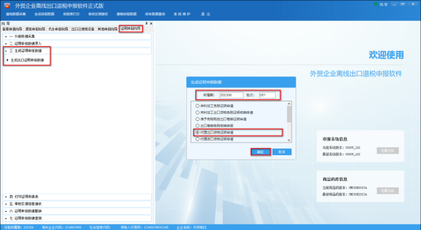 选择申报系统“证明申报向导”第三步“生成证明申报数据”,选择“代理出口货物证明申请”,输入“所属期”及“批次”,再点击【确定】按钮,生成申报数据保存至本地电脑。如图: