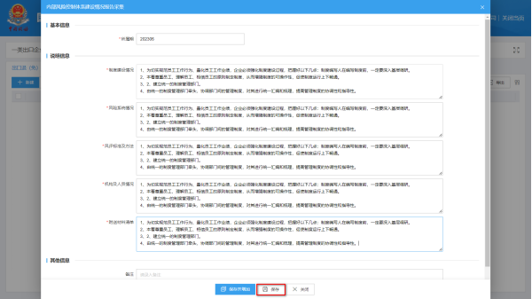 选择申报系统“其他申报向导”第一步“其他申报数据采集->出口企业内部风控体系建设情况报告”,点击【增加】按钮,录入制度建设情况、风险系统情况、风险标准及方法等内容。如图: