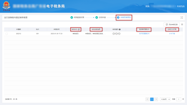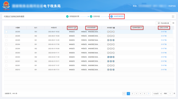 完成正式申报后,可实时查询税务机关对该证明业务的审核状态及流程信息。如图: