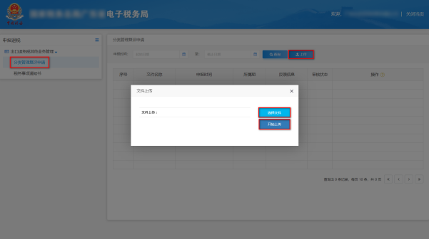 选择“分类管理复评申请”进入“正式申报”界面,点击【上传】按钮,再点击【选择文件】按钮,选择生成的申报数据文件,最后再点击【开始上传】按钮,完成正式申报操作。
