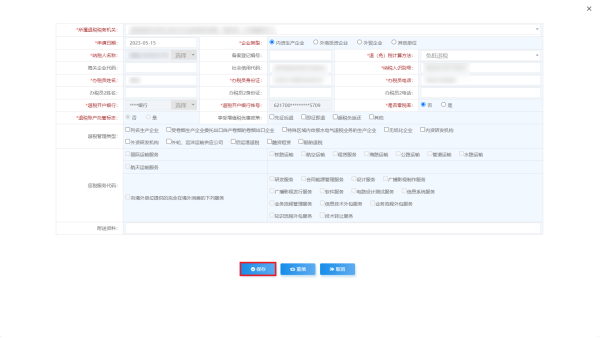 点击【采集】按钮,录入纳税人名称、纳税人识别号、企业类型、办税员信息、退税账户信息等内容。然后再点击【保存】按钮,完成出口退(免)税备案数据的采集及生成申报数据的操作。如图: