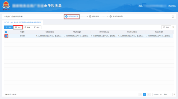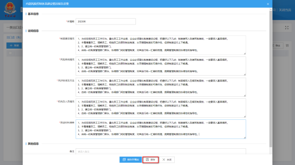 需要修改数据时,勾选需要修改的记录,点击【打开】按钮,弹出出口企业内部风控体系建设情况报告编辑界面,进行相应字段的修改。如图: