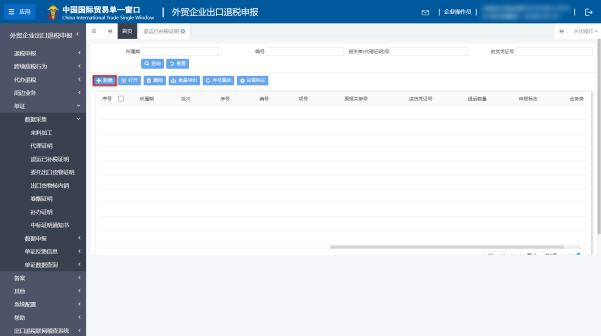选择申报系统“证明申报向导”第二步“证明申报数据录入->出口货物已补税/未退税证明”,点击【增加】按钮,录入出口报关单号、进货凭证号码等内容。如图: